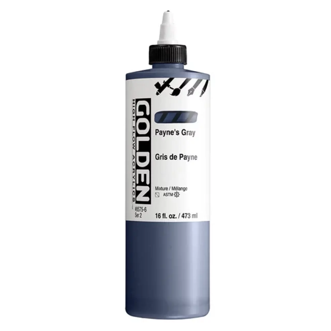 High Flow Acrylics zijn ultradunne verf met een inktachtige consistentie die ongelooflijk veelzijdig is. Ze kunnen rechtstreeks uit de fles worden gebruikt in een airbrush, navulbare marker of kroontjespen en zijn zeer geschikt voor tekenen, beitsen, druppelen, gieten, kalligrafie en kleurwasbeurten. High Flow biedt een palet met veel kleuren met één pigment, evenals fluorescerende en iriserende kleuren. Hoewel het werkt als inkt, is het acrylverf en dus compatibel met andere GOLDEN acrylverfkleuren en -mediums.