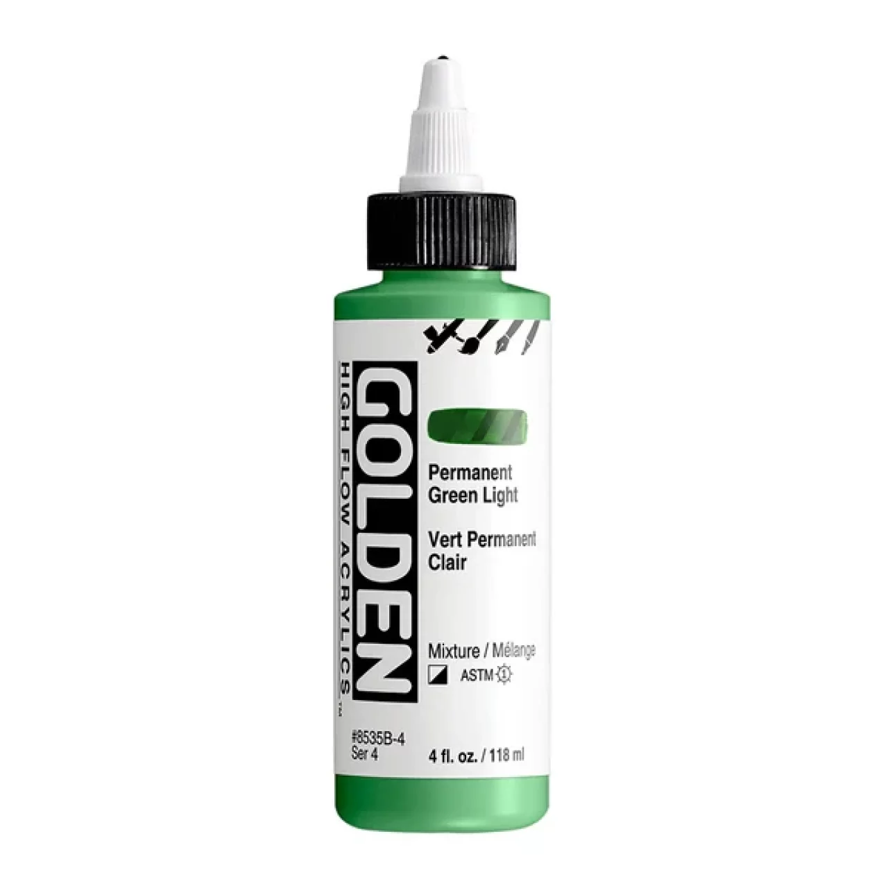High Flow Acrylics zijn ultradunne verf met een inktachtige consistentie die ongelooflijk veelzijdig is. Ze kunnen rechtstreeks uit de fles worden gebruikt in een airbrush, navulbare marker of kroontjespen en zijn zeer geschikt voor tekenen, beitsen, druppelen, gieten, kalligrafie en kleurwasbeurten. High Flow biedt een palet met veel kleuren met één pigment, evenals fluorescerende en iriserende kleuren. Hoewel het werkt als inkt, is het acrylverf en dus compatibel met andere GOLDEN acrylverfkleuren en -mediums.