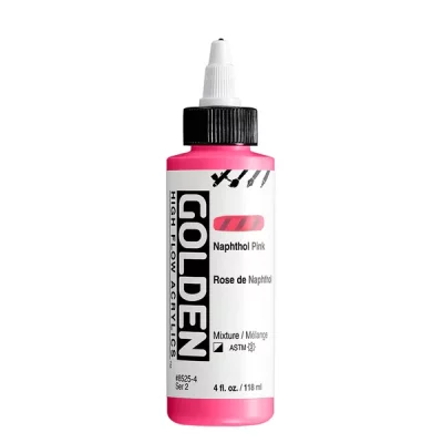 High Flow Acrylics zijn ultradunne verf met een inktachtige consistentie die ongelooflijk veelzijdig is. Ze kunnen rechtstreeks uit de fles worden gebruikt in een airbrush, navulbare marker of kroontjespen en zijn zeer geschikt voor tekenen, beitsen, druppelen, gieten, kalligrafie en kleurwasbeurten. High Flow biedt een palet met veel kleuren met één pigment, evenals fluorescerende en iriserende kleuren. Hoewel het werkt als inkt, is het acrylverf en dus compatibel met andere GOLDEN acrylverfkleuren en -mediums.
