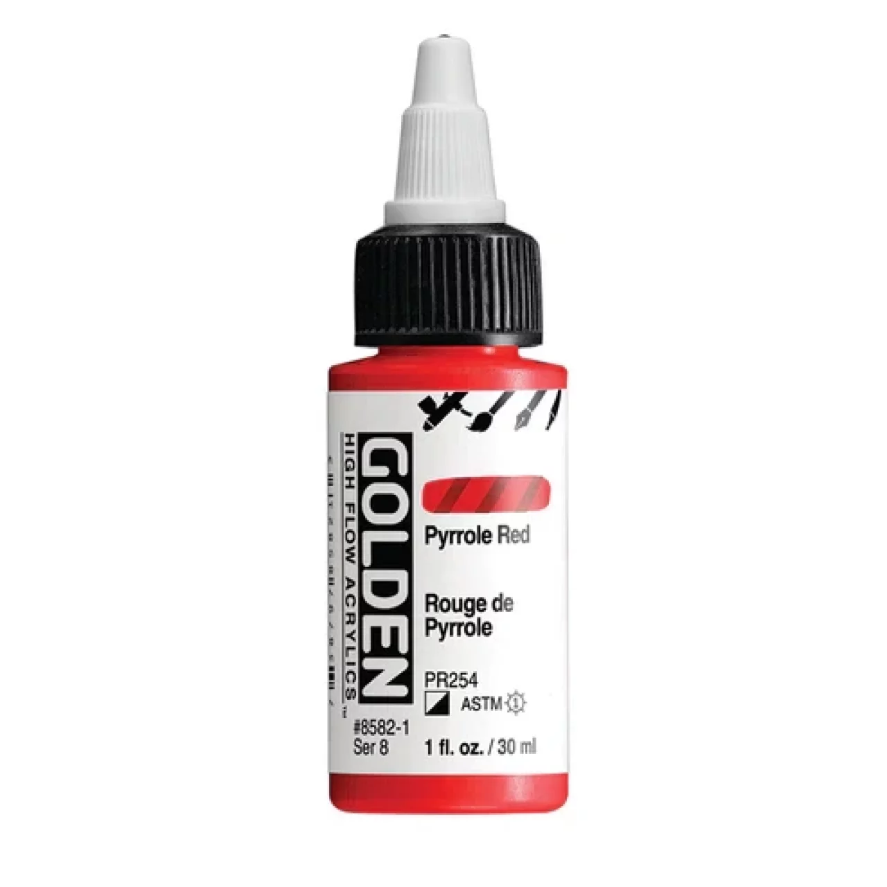 High Flow Acrylics zijn ultradunne verf met een inktachtige consistentie die ongelooflijk veelzijdig is. Ze kunnen rechtstreeks uit de fles worden gebruikt in een airbrush, navulbare marker of kroontjespen en zijn zeer geschikt voor tekenen, beitsen, druppelen, gieten, kalligrafie en kleurwasbeurten. High Flow biedt een palet met veel kleuren met één pigment, evenals fluorescerende en iriserende kleuren. Hoewel het werkt als inkt, is het acrylverf en dus compatibel met andere GOLDEN acrylverfkleuren en -mediums.