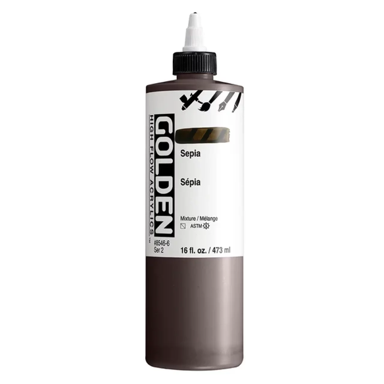High Flow Acrylics zijn ultradunne verf met een inktachtige consistentie die ongelooflijk veelzijdig is. Ze kunnen rechtstreeks uit de fles worden gebruikt in een airbrush, navulbare marker of kroontjespen en zijn zeer geschikt voor tekenen, beitsen, druppelen, gieten, kalligrafie en kleurwasbeurten. High Flow biedt een palet met veel kleuren met één pigment, evenals fluorescerende en iriserende kleuren. Hoewel het werkt als inkt, is het acrylverf en dus compatibel met andere GOLDEN acrylverfkleuren en -mediums.