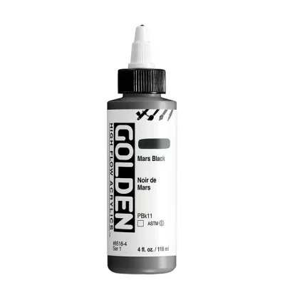 High Flow Acrylics zijn ultradunne verf met een inktachtige consistentie die ongelooflijk veelzijdig is. Ze kunnen rechtstreeks uit de fles worden gebruikt in een airbrush, navulbare marker of kroontjespen en zijn zeer geschikt voor tekenen, beitsen, druppelen, gieten, kalligrafie en kleurwasbeurten. High Flow biedt een palet met veel kleuren met één pigment, evenals fluorescerende en iriserende kleuren. Hoewel het werkt als inkt, is het acrylverf en dus compatibel met andere GOLDEN acrylverfkleuren en -mediums.