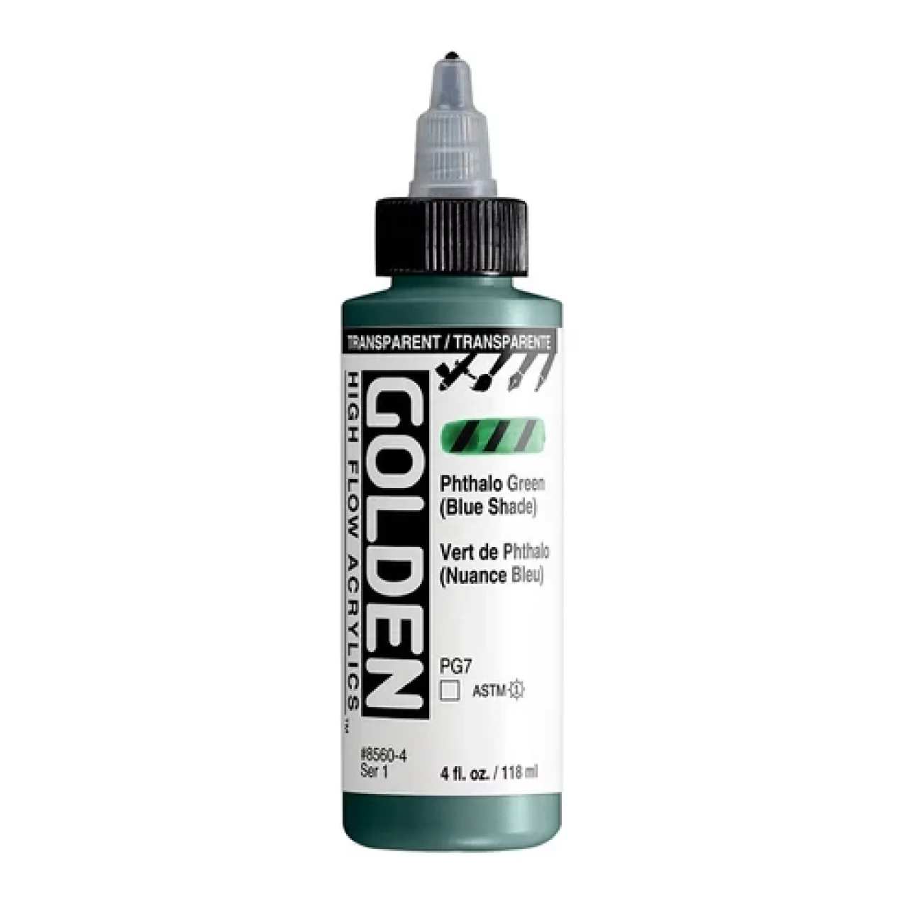 High Flow Acrylics zijn ultradunne verf met een inktachtige consistentie die ongelooflijk veelzijdig is. Ze kunnen rechtstreeks uit de fles worden gebruikt in een airbrush, navulbare marker of kroontjespen en zijn zeer geschikt voor tekenen, beitsen, druppelen, gieten, kalligrafie en kleurwasbeurten. High Flow biedt een palet met veel kleuren met één pigment, evenals fluorescerende en iriserende kleuren. Hoewel het werkt als inkt, is het acrylverf en dus compatibel met andere GOLDEN acrylverfkleuren en -mediums.