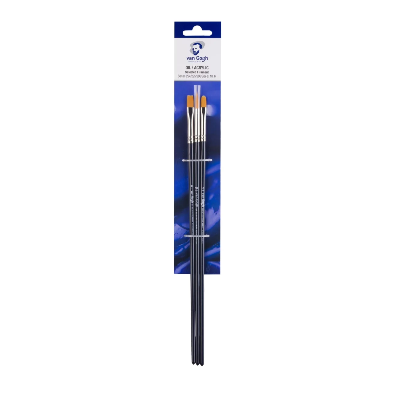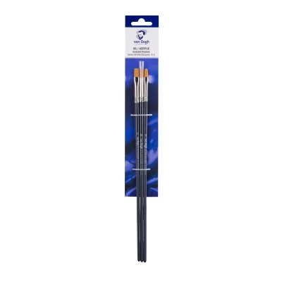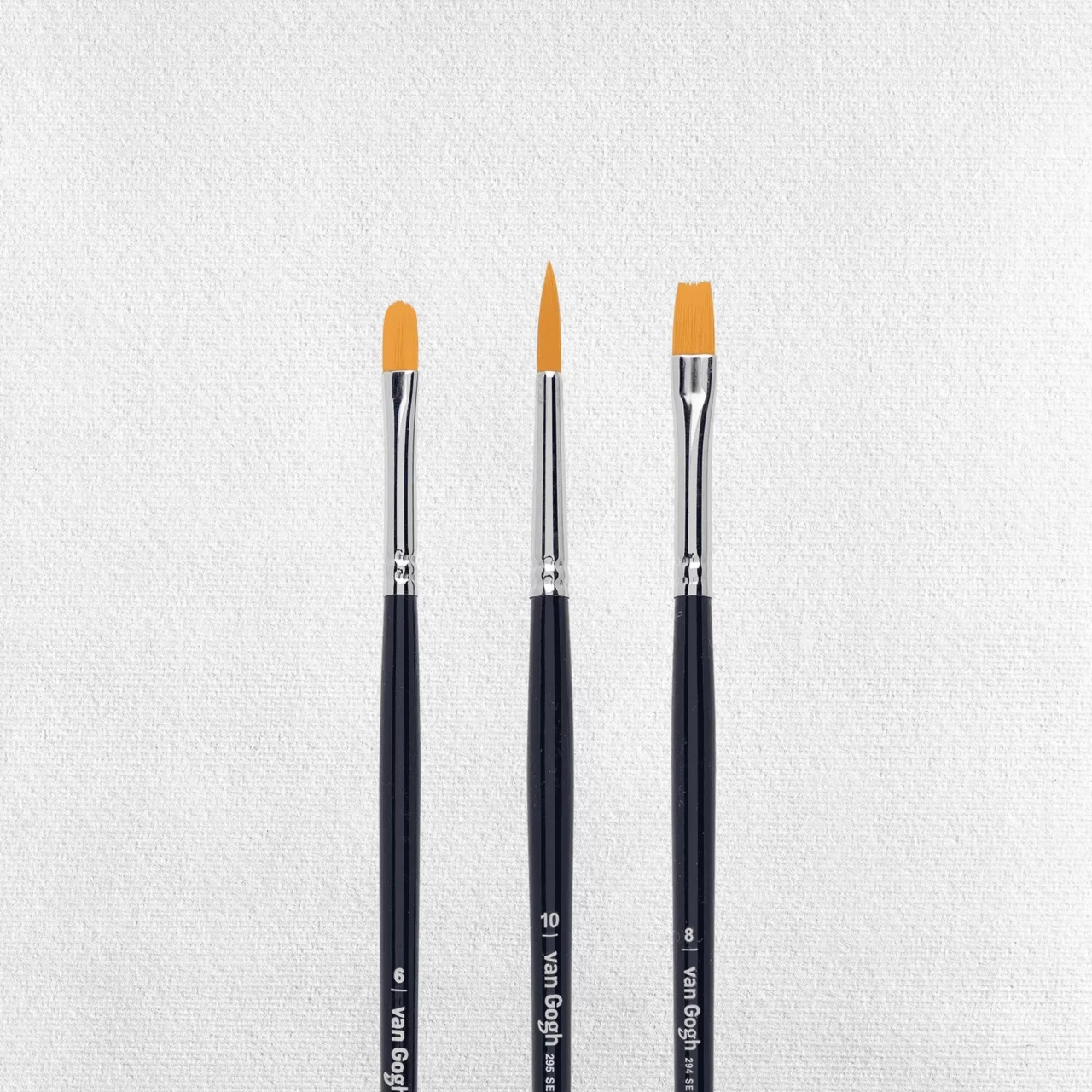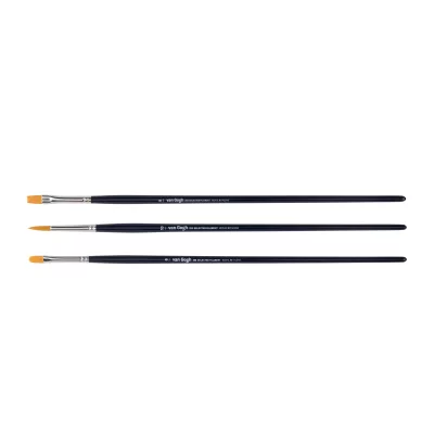Dit met zorg gemaakte en met de hand gevormde penseel voor olie- en acrylverf heeft een flexibele haarbundel die bestand is tegen slijtage. Door de flexibiliteit van de gouden synthetische haarbundel is dit penseel bijzonder geschikt voor acrylverf, aangezien acrylverf normaal gesproken in een vloeibaarder consistentie wordt gebruikt. Deze set bevat drie penselen in verschillende vormen. De platte penseel (Gussow) kan worden gebruikt om scherpe randen en rechte lijnen te creƫren, de ronde en puntige penseel is voor de fijnere details en de laatste heeft de vorm van een kattentong (filbert) die de voordelen van platte en ronde penselen combineert. De breedte van de haarbundels op de inbegrepen penselen is 7,0 mm (plat/Gussow), 4,3 mm (rond met een fijne punt) en 5,9 mm (kattentong)